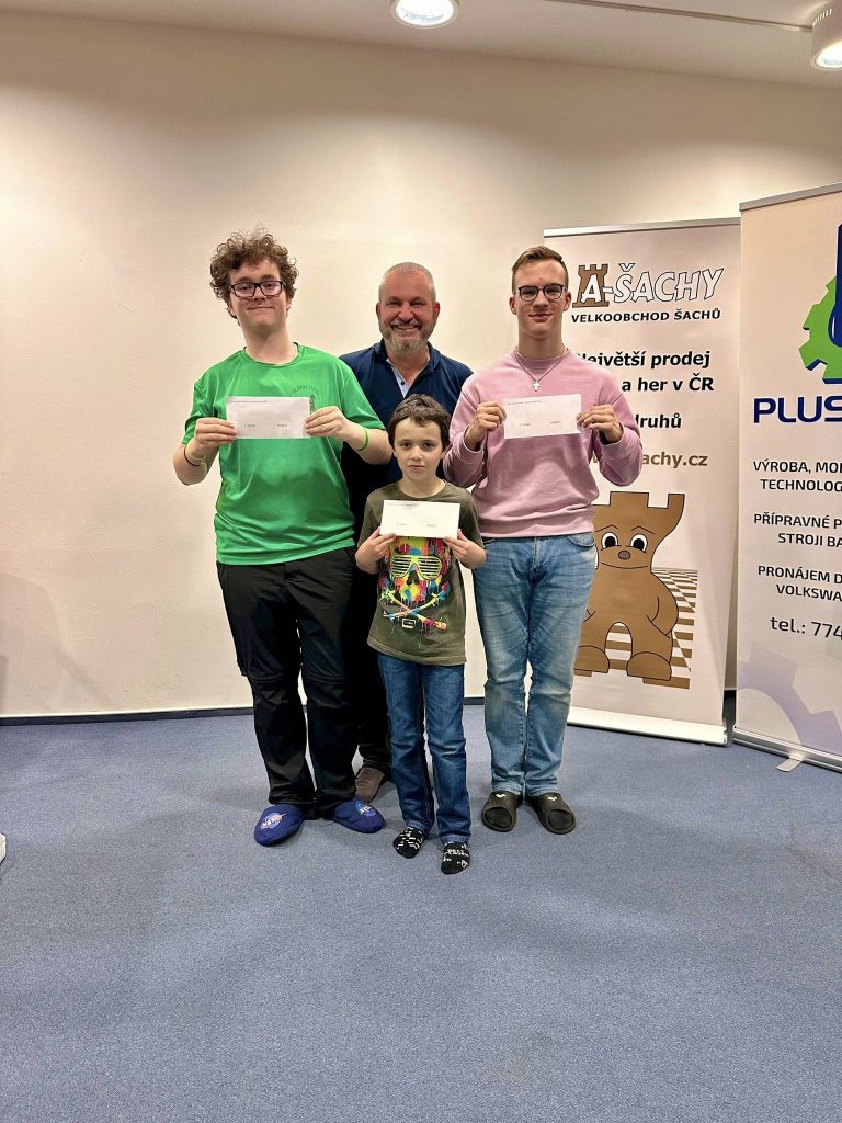 Medailisté mládež, zleva: vítěz Tobias Svoboda, ředitel turnaje Petr Dostál, bronzový Adam Kovalčík, ve předu stříbrný Damian Židek