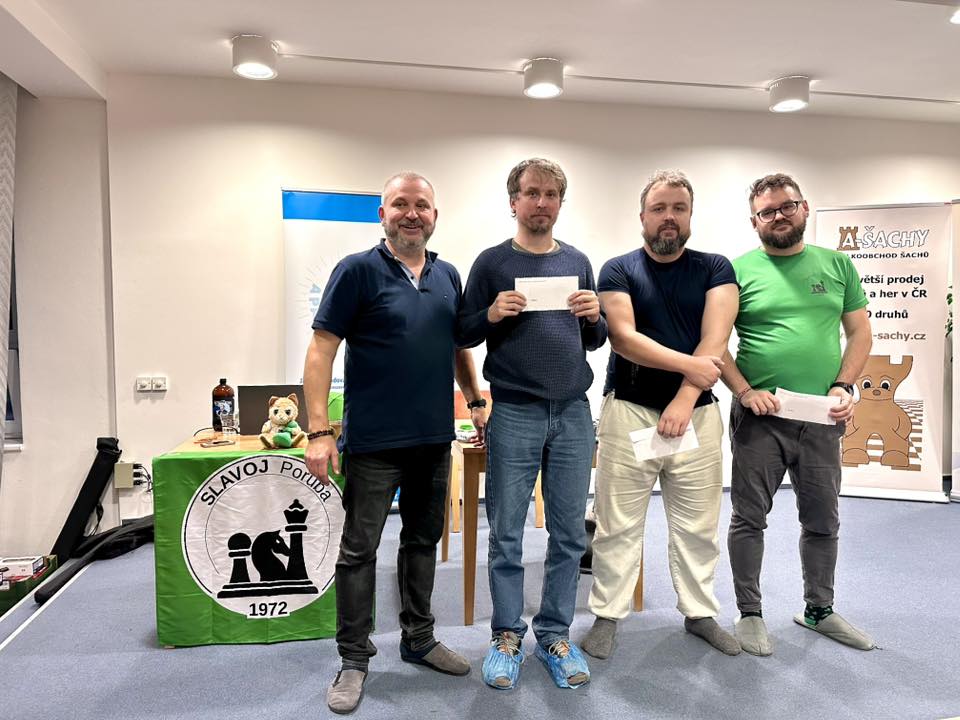Zleva: Ředitel turnaje Petr Dostál, bronzový Tomáš Očkay, vítěz CM Václav Židek, stříbrný Richard Kudla